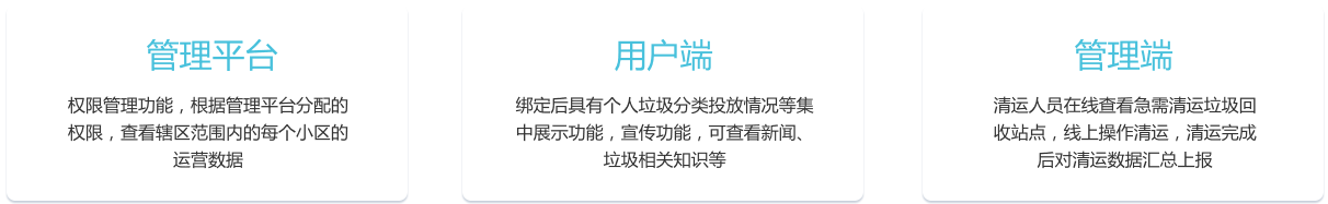 對垃圾分類進(jìn)行智能化精細(xì)管理,通過平臺管理,實(shí)現(xiàn)綜合、完善、高效的垃圾投放、 回收及利用,各垃圾站實(shí)行全天候監(jiān)控,最終實(shí)現(xiàn)人、事物的高效追蹤和管理。 |