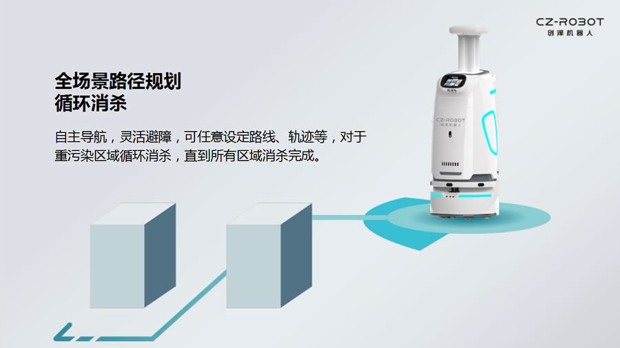 消毒機器人在疫情現場,重點針對患者、醫護、醫廢的G頻活動區域進行沿路經自動G水平消毒,重點針對患者和醫護人員的所處區域進行多點終末消毒。
