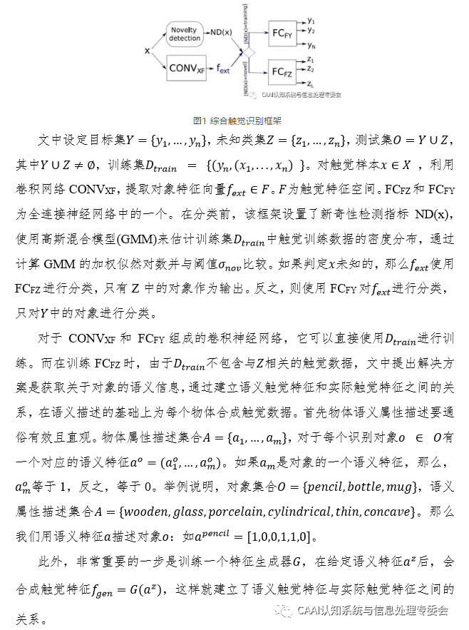 機(jī)器人通過收集大量觸覺數(shù)據(jù)來(lái)識(shí)別物體的方法存在一定的限制。一方面機(jī)器人觸覺傳感器收集大量物體的觸覺數(shù)據(jù)過程資源耗費(fèi)大,另一方面日常生活能接觸到的物體種類龐大。近期在IEEE TRANSACTIONS ON INDUSTRIAL INFORMATICS發(fā)表的一篇《A Deep Learning Framework forTactile Recognition of Known as Well as Novel Objects》文章中提出了一種基于卷積神經(jīng)網(wǎng)絡(luò)的綜合觸覺識(shí)別框架,它可以利用對(duì)象的語(yǔ)義屬性描述和觸覺數(shù)據(jù)的融合來(lái)實(shí)現(xiàn)對(duì)新對(duì)象的識(shí)別。相對(duì)于傳統(tǒng)學(xué)習(xí)方法有較大優(yōu)勢(shì),因?yàn)檎Z(yǔ)義信息更容易獲得,可以由人工[1]提供,也可以從語(yǔ)義數(shù)據(jù)庫(kù)(如Wikipedia[2])自動(dòng)挖掘。