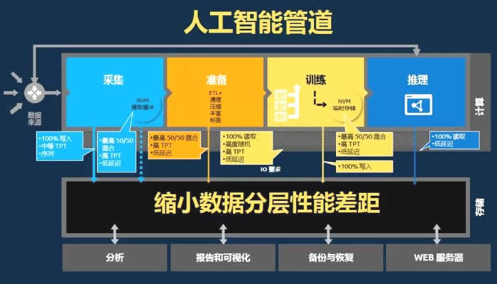 “工欲善其事,必先利其器”,要想發揮出AI人工智能技術的大威力,需要企業構建強有力的IT基礎設施。這個設施不僅需要強有力的處理器、FPGA、GPU,也需要G性能的存儲設備,否則就會如普通電腦一般,因為機械硬盤傳輸速度慢,尋找數據的時間長,往往會成為整個系統性能的瓶頸,即使是SATA/PCIe NAND SSD,很多時候也跟不上AI數據處理的需求。倪錦峰先生介紹到,無論用于哪個行業,人工智能的工作實際上主要由采集、準備、訓練和推理四部分組成。每個部分需要讀寫不同類型的數據,工作負載也不盡相同,將給存儲設備帶來較大的挑戰。