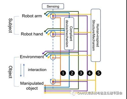 文章介紹了G精度機器人操控的五類方法:(1)基于傳感信息的方法(2)基于柔順機構的方法(3)基于環境約束的方法(4)基于感知約束集成的方法(5)仿生的方法。如圖1所示,示意圖展示了五類方法之間的差異。在機器人操控中,主體是機器人的手臂和手,客體是環境和被操控的對象。虛線表示傳感信息,回路表示傳感器感知到的狀態。