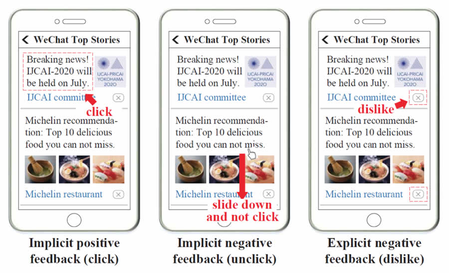 推薦系統(tǒng)在日常生活中被廣泛使用,為用戶獲取信息與娛樂提供便利。推薦系統(tǒng)算法往往基于用戶與系統(tǒng)的交互,這些交互行為可以大致分為以下兩類:顯式反饋與隱式反饋。顯式反饋從用戶對于物品的直接態(tài)度中獲取,例如評論中的一星到五星,或者微信看一看系統(tǒng)中的“不感興趣”按鈕。這類反饋能夠直接表達(dá)用戶的正向以及負(fù)向偏好,但是這類反饋的數(shù)量往往不多。隱式反饋從用戶的行為中間接獲得,例如用戶的點擊/不點擊行為。這些信息在推薦系統(tǒng)中往往是海量的,但是這些信息有著較多噪聲(用戶點擊的并不一定是他真正喜歡的)。另外,隱式反饋通常是以正反饋的形式出現(xiàn),推薦中的隱式負(fù)反饋存在巨大噪聲(未展現(xiàn)信息或者未點擊信息并不一定意味著用戶不喜歡這些內(nèi)容)。