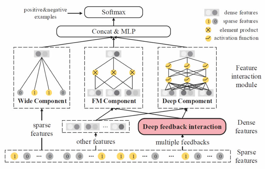 DFN模型主要分為三個階段:首先,deep feedback interaction module以用戶的多種反饋行為作為輸入,輸出用戶的反饋特征。然后,F(xiàn)eature Interaction Module進(jìn)一步考慮用戶的其它特征和物品特征,使用FM、Deep和Wide層進(jìn)行特征交互。后,輸出層使用CTR作為訓(xùn)練目標(biāo)。圖2給出了DFN的整體結(jié)構(gòu)。