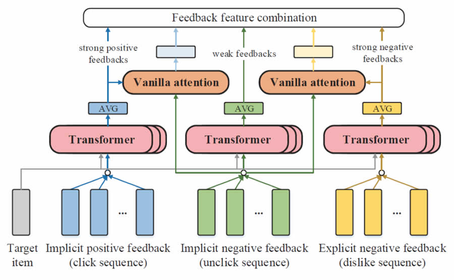首先,在Internal Feedback Interaction Component中,用戶的隱式正反饋、隱式負(fù)反饋和顯式負(fù)反饋序列和target item一起,通過一個transformer層,得到了在各個序列內(nèi)部細(xì)粒度的item-level的交互信息,然后經(jīng)過average層得到三種反饋的特征表示,其中隱式正反饋特征中蘊含G質(zhì)量的用戶正向偏好,顯式負(fù)反饋特征中蘊含G質(zhì)量的用戶負(fù)向偏好。