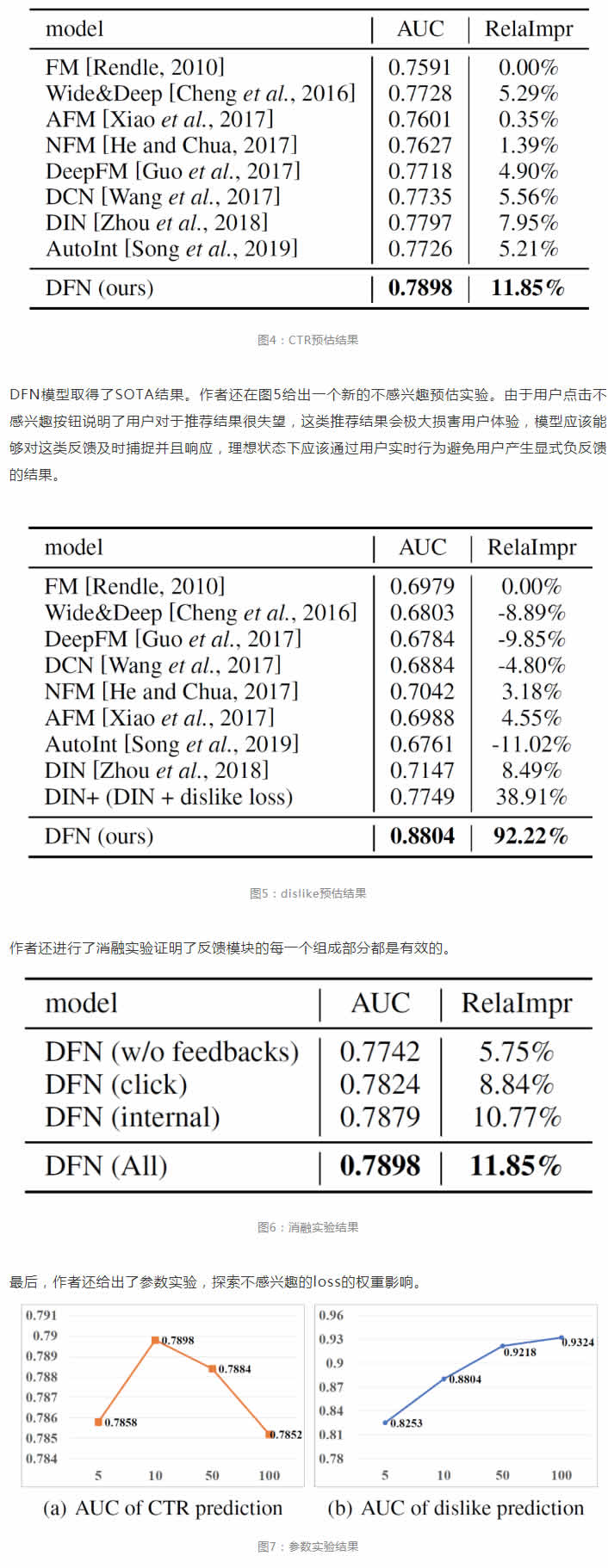 DFN模型使用了internal feedback interaction component抓住用戶行為序列中的細(xì)粒度的行為級別的交互,然后通過external feedback interaction component,使用準(zhǔn)確但稀少的隱式正反饋和顯式負(fù)反饋作為監(jiān)督,從噪音較多的隱式負(fù)反饋中進(jìn)一步抽取用戶的正負(fù)反饋信息。在實驗中,作者基于微信看一看的數(shù)據(jù),進(jìn)行了豐富的離線和在線實驗,模型與baseline相比均取得顯著提升。
