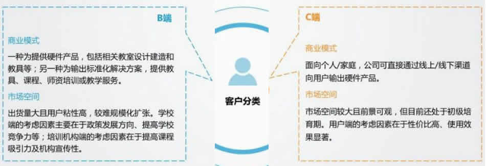 由于教育機器人涉及教育內容的專業性等眾多因素,因此眾多公司均從針對學校及培訓機構的產品開始做起,然后再逐漸拓展C端市 場。一方面,從B端切入可以讓學校或培訓機構做背書,幫助企業提G影響力,積累潛在客戶;另一方面,擴展C端業務不僅能解決 TO B模式的客單價彳氐且難規模擴張的問題,同時能通過B端引流,降低TO C模式的G獲客成本。