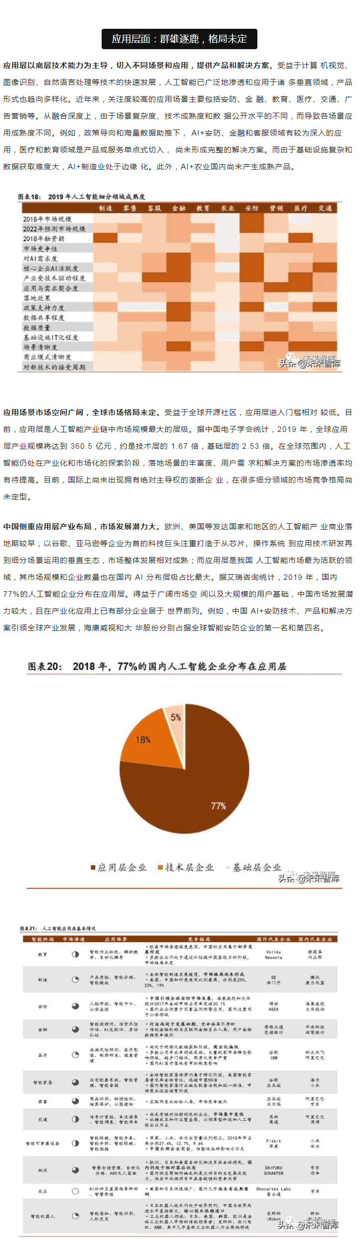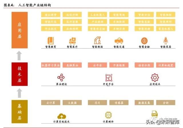 目前,人工智能產(chǎn)業(yè)的生態(tài)系統(tǒng)正逐步成型。依據(jù)產(chǎn)業(yè)鏈上下游關(guān)系,可以將人工智 能劃分為基礎(chǔ)支持層、中間技術(shù)層和下游應(yīng)用層。基礎(chǔ)層是人工智能產(chǎn)業(yè)的基礎(chǔ),主要提 供硬件(芯片和傳感器)及軟件(算法模型)等基礎(chǔ)能力;技術(shù)層是人工智能產(chǎn)業(yè)的核心, 以模擬人的智能相關(guān)特征為出發(fā)點(diǎn),將基礎(chǔ)能力轉(zhuǎn)化成人工智能技術(shù),如計(jì)算機(jī)視覺、智 能語音、自然語言處理等應(yīng)用算法研發(fā)。其中,技術(shù)層能力可以廣泛應(yīng)用到多個(gè)不同的應(yīng) 用L域;應(yīng)用層是人工智能產(chǎn)業(yè)的延伸,將技術(shù)應(yīng)用到具體行業(yè),涵蓋制造、交通、金融、 醫(yī)療等 18 個(gè)L域,其中醫(yī)療、交通、制造等L域的人工智能應(yīng)用開發(fā)受到廣泛關(guān)注。