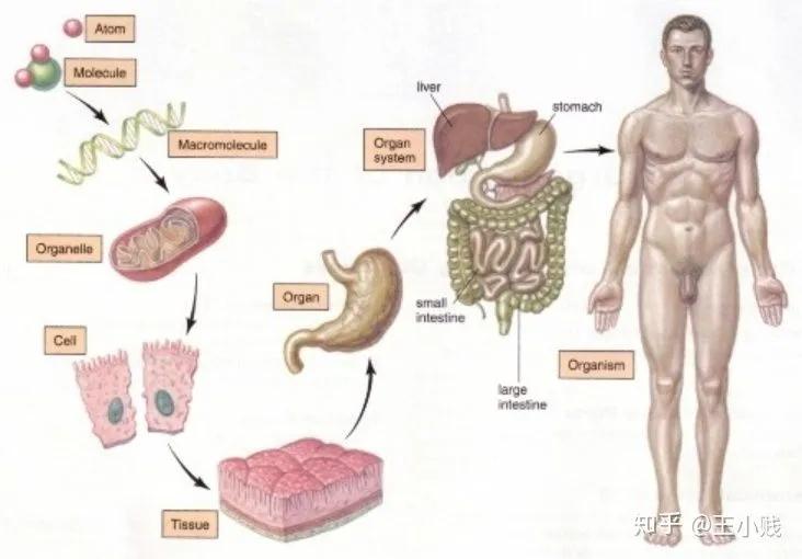 通過(guò)上一節(jié)的介紹我們也了解到,深度學(xué)習(xí)的黑箱性主要來(lái)源于其G度非線性性質(zhì),每個(gè)神經(jīng)元都是由上一層的線性組合再加上一個(gè)非線性函數(shù)的得到,我們無(wú)法像理解線性回歸的參數(shù)那樣通過(guò)非常solid的統(tǒng)計(jì)學(xué)基礎(chǔ)假設(shè)來(lái)理解神經(jīng)網(wǎng)絡(luò)中的參數(shù)含義及其重要程度、波動(dòng)范圍。但實(shí)際上我們是知道這些參數(shù)的具體值以及整個(gè)訓(xùn)練過(guò)程的,所以神經(jīng)網(wǎng)絡(luò)模型本身其實(shí)并不是一個(gè)黑箱,其黑箱性在于我們沒(méi)辦法用人類可以理解的方式理解模型的具體含義和行為,而神經(jīng)網(wǎng)絡(luò)的一個(gè)非常好的性質(zhì)在于神經(jīng)元的分層組合形式,這讓我們可以用物質(zhì)組成的視角來(lái)理解神經(jīng)網(wǎng)絡(luò)的運(yùn)作方式。比如如下圖所示,人體的組成過(guò)程是從分子-細(xì)胞-組織-器官-系統(tǒng)-人體:
