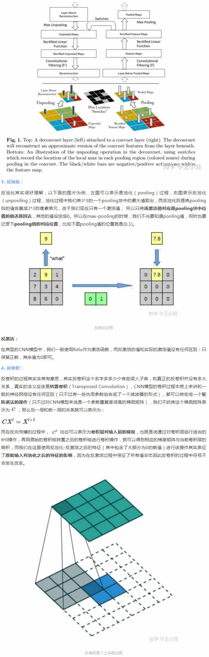要理解神經(jīng)網(wǎng)絡(luò)中每層都學(xué)到了哪些概念一個(gè)非常直觀的方法就是通過(guò)對(duì)隱層運(yùn)用一些可視化方法來(lái)將其轉(zhuǎn)化成人類可以理解的有實(shí)際含義的圖像,這方面一個(gè)非常具有代表性的一個(gè)工作就是14年ECCV的一篇經(jīng)典之作:《Visualizing and Understanding Convolutional Networks》,這篇文章主要利用了反卷積的相關(guān)思想實(shí)現(xiàn)了特征可視化來(lái)幫助我們理解CNN的每一層究竟學(xué)到了什么東西。我們都知道典型的CNN模型的一個(gè)完整卷積過(guò)程是由卷積-激活-池化(pooling)三個(gè)步驟組成的。而如果想把一個(gè)CNN的中間層轉(zhuǎn)化成原始輸入空間呢?我們就需要經(jīng)過(guò)反池化-反激活-反卷積這樣的一個(gè)逆過(guò)程。整個(gè)模型的結(jié)構(gòu)如下圖所示: