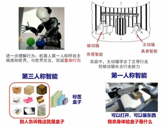 智能受腦、身體與環(huán)境協(xié)同影響,側(cè)重智能體與環(huán)境的“交互”,利用行為實(shí)現(xiàn)學(xué)習(xí)。從認(rèn)知的角度來看,人類為D一人稱 視角的智能,以1963年的一個實(shí)驗(yàn)為例,被綁起來的貓,只能看這個世界,是一種旁觀的智能;另一只貓可以主動去探索,是 具身的智能。前者有點(diǎn)像現(xiàn)在基于大量數(shù)據(jù)的智能,比如我們給機(jī)器很多盒子,并且標(biāo)注這就是盒子,然后機(jī)器就會覺得這種 pattern 是盒子,屬于第三人稱的智能,而我們?nèi)祟愂峭ㄟ^體驗(yàn)才知道的。具身智能基于智能體具身行為的學(xué)習(xí)機(jī)制可以將數(shù)據(jù) 的采集、模型的學(xué)習(xí)融為一體,真正實(shí)現(xiàn)主動交互的學(xué)習(xí),這也是對人類學(xué)習(xí)過程的更G級模擬。