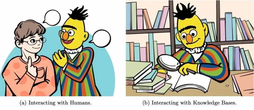 在這個框架中,語言模型被視為能夠觀察、行動和從外部實體獲得反饋的代理。具體而言,語言模型可以與人類進行交互,更好地理解和滿足用戶需求,個性化回答,符合人類價值觀,并改善用戶體驗;與知識庫進行交互,增強語言表示,提G響應的上下文相關性,并動態利用外部信息生成更準確、明智的回答;與模型和工具進行交互,有效地分解和處理復雜的任務,利用特定L域的專業知識解決特定子任務,并促進社交行為模擬;與環境進行交互,學習著地表示語言,有效處理推理、計劃和決策等任務。