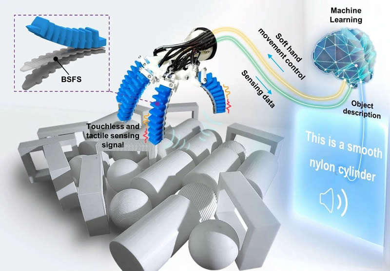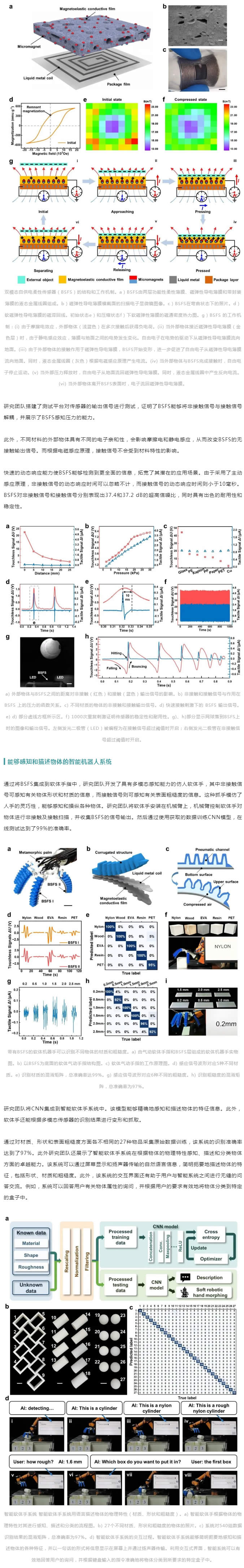 迄今為止,人們已經為開發多模態柔性傳感器做出了許多努力,然而在分離和解耦各種刺激類型的信號方面仍存在挑戰。雖然研究人員一直致力于開發具有多模態柔性傳感器的智能機器人以感知各種環境信息,然而,目前的智能機器手缺乏多面的多模態信息感知,尤其是對表面物理特性的描述能力。這些局限性為軟體機器手進一步感知多模態環境信息和執行精細操作任務造成了阻礙。
