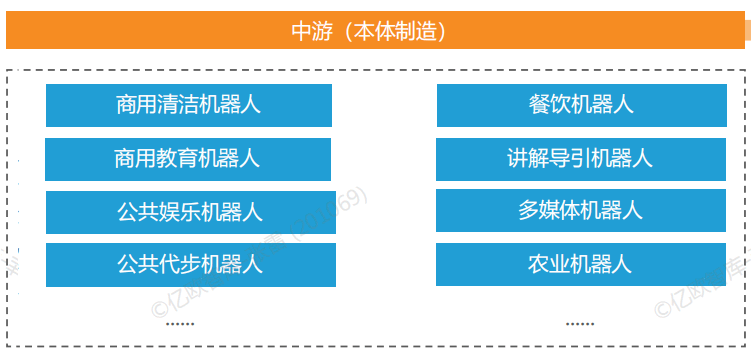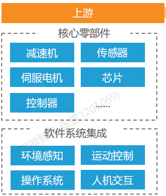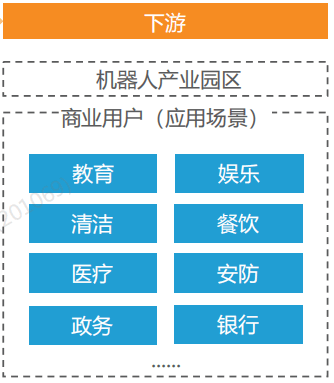 公共服務(wù)機(jī)器人產(chǎn)業(yè)鏈可分為,上游核心零部件、軟件系統(tǒng)開發(fā)、中游機(jī)器人本體制造、下游機(jī)器人分銷商與各場景商業(yè)用戶。