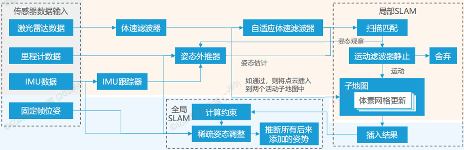 以谷歌開發的二維SLAM算法Cartographer為例:算法在前端完成占據柵格地圖的構建,得出激光雷達掃描幀的佳位姿后,將掃描幀插入到子地圖中,得到局部優化的子地圖并記錄位姿;后端根據掃描幀間的位姿關系進行全局的地圖優化,得出閉環掃描幀在全局地圖中的佳位姿。
