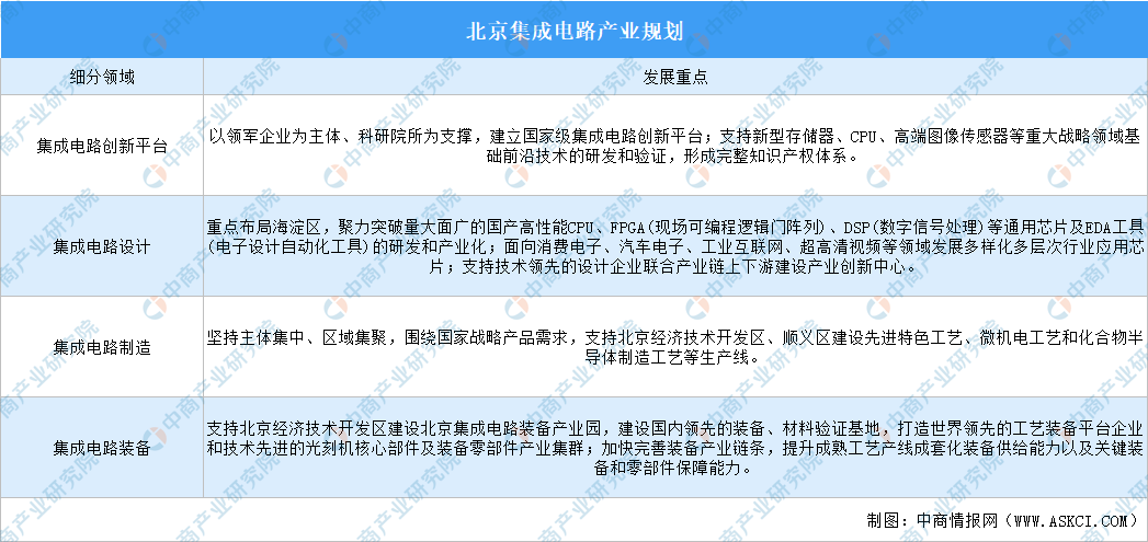 集成電路:以自主突破、協同發(fā)展為重點,構建集設計、制造、裝備和材料于一體的集成電路產業(yè)創(chuàng)新G地,打造具有國際競爭力的產業(yè)集群。重點布局北京經濟技術開發(fā)區(qū)、海淀區(qū)、順義區(qū),力爭到2025年集成電路產業(yè)實現營業(yè)收入3000億元。