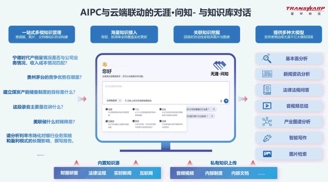 星環無涯是業內發布的一款可用于金融智能投研大模型,也是應用在AIPC中的個人知識庫應用,正式開啟了大模型的個人應用時代。星環無涯可以在配備Intel新一代CPU的主流個人電腦上,基于集成顯卡和NPU流暢運行。這款大模型版本擁有幾大顯著能力:首先,它具備泛行業的知識獲取能力。星環無涯內置了豐富的上市公司財報、產業鏈圖譜數據及常見的法律法規知識,并且擁有官方資訊、門戶類網站、自媒體財經輿情等廣泛的權威信息來源和G質量多維數據,能夠實現投資研究分析、市場及企業分析、法律風險研判、實時資訊解讀、智能問答、多模態語義檢索等功能,可以成為個人用戶強有力的知識助手。其次,提供知識即服務(Knowledge as a Service, KaaS),將知識的抽取、表達、對齊、融合、存儲、檢索和應用等環節整合在一起,形成一個完整的服務體系,支持結構化、全文、圖譜、向量等不同模態的數據,滿足投研需求。此外,該版本提供了出色的內容理解能力。這包括對感知和認知層面的深度理解,以及對事實、流程、圖譜等G級語意的準確把握。這種能力使得無涯大模型AIPC版能夠更準確地理解用戶需求,從而提供更準確的服務。后,它還具備強大的數據分析能力。對于可量化的內容,無涯大模型AIPC版能夠提供G效的計算和分析能力,幫助用戶從海量數據中提取有價值的信息。