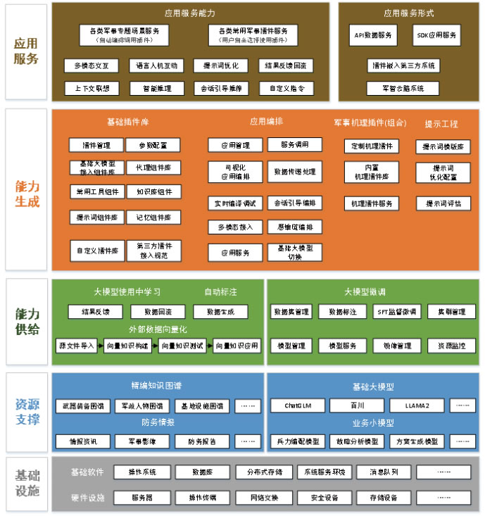 基于大模型的云平臺(tái)智能運(yùn)維系統(tǒng)從下至上,分為基礎(chǔ)設(shè)施層、資源支撐層、能力供給層、能力生成層和應(yīng)用服務(wù)層,如下突所示。