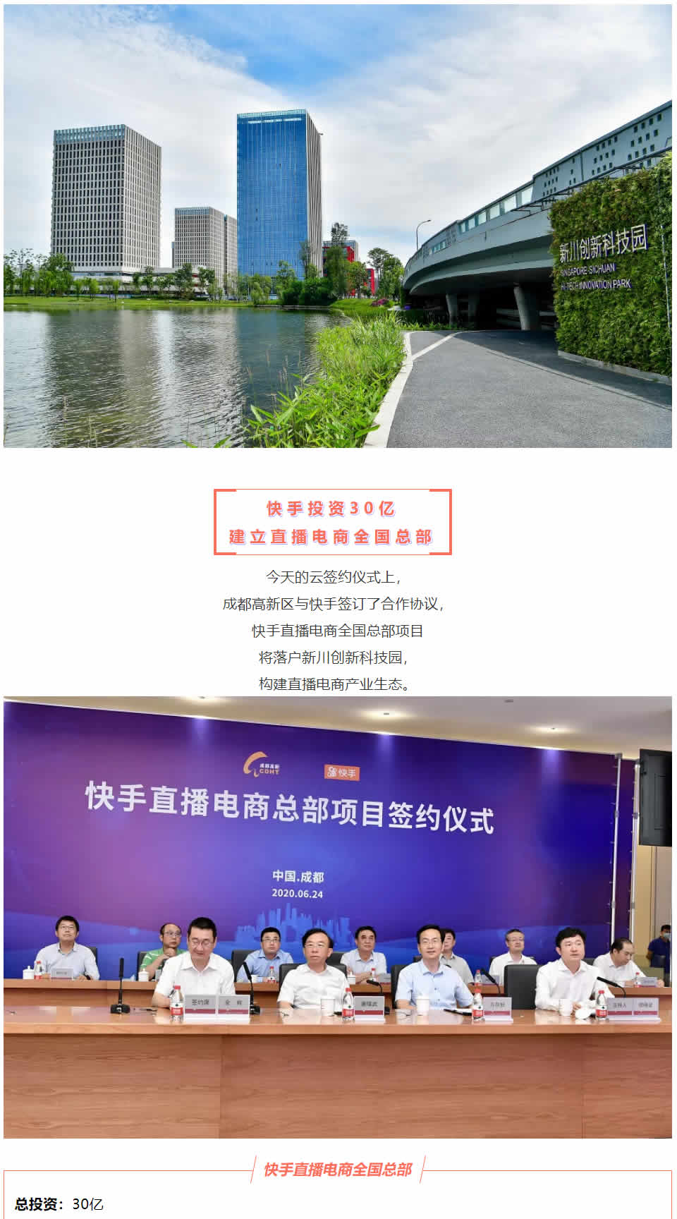 成都G新區分別與頭部短視頻平臺快手、中國互聯網BAT三巨頭之一的百度簽約,宣布快手直播電商全國總部項目和百度智能駕駛項目落戶新川創新科技園。