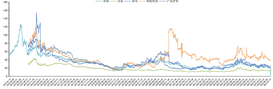 在AIGC賦能等驅(qū)動下,傳媒行業(yè)及其子版塊估值明顯抬升。2024年以來傳媒行業(yè)估值PE-TTM震蕩調(diào) 整,近期回落。當前申萬傳媒指數(shù)對應估值PE-TTM為20X,整體估值處于歷史較低水平。
