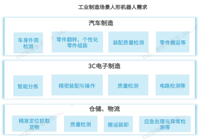工業制造場景因其單—性和重復性特點,是人形機器人應用易實現落地的場景, 并終過渡至C端場景中。