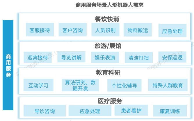 短期1-3年在商用服務L域,細分應用如展覽講解及科研教育已落地;中期3-5年在J端作業方面替代人工在危險/惡劣環境下執行任務;遠期5年以上適應復雜空間環境
