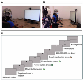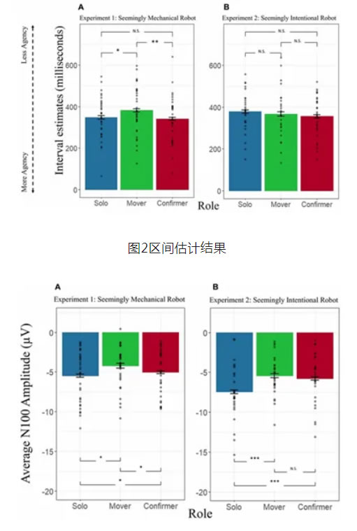 在這項研究中,科學(xué)家們使用了時間間隔估計任務(wù)(如圖2)和腦電圖(EEG)(如圖3)來評估人們在與機器人合作時是否能感受到共同代理感(Sense of Joint Agency, SoJA),以及這種感覺是否受到人們對機器人意圖歸因的影響。
