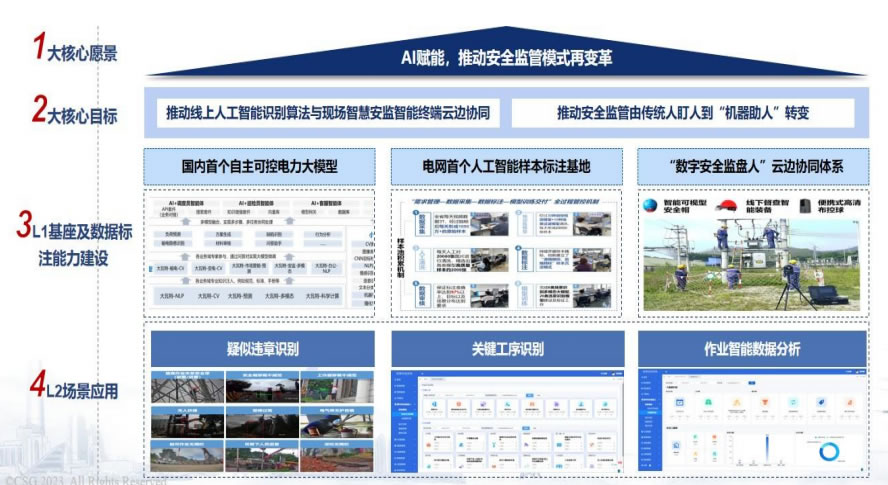 基于公司大瓦特生態技術體系,推動安全監管模式再變革 1 大核心愿景,細化 2 大核心目標,依托大瓦特 L0 電力基礎大模型、電網人工智能樣本標注基地、“數字安全監盤人”功能L先為 3 大核心基礎,構建疑 似違章識別、關鍵工序識別、作業智能數據分析等 3 大核心功能的人工智能推動安監模式變革建設“1234”總體框架。