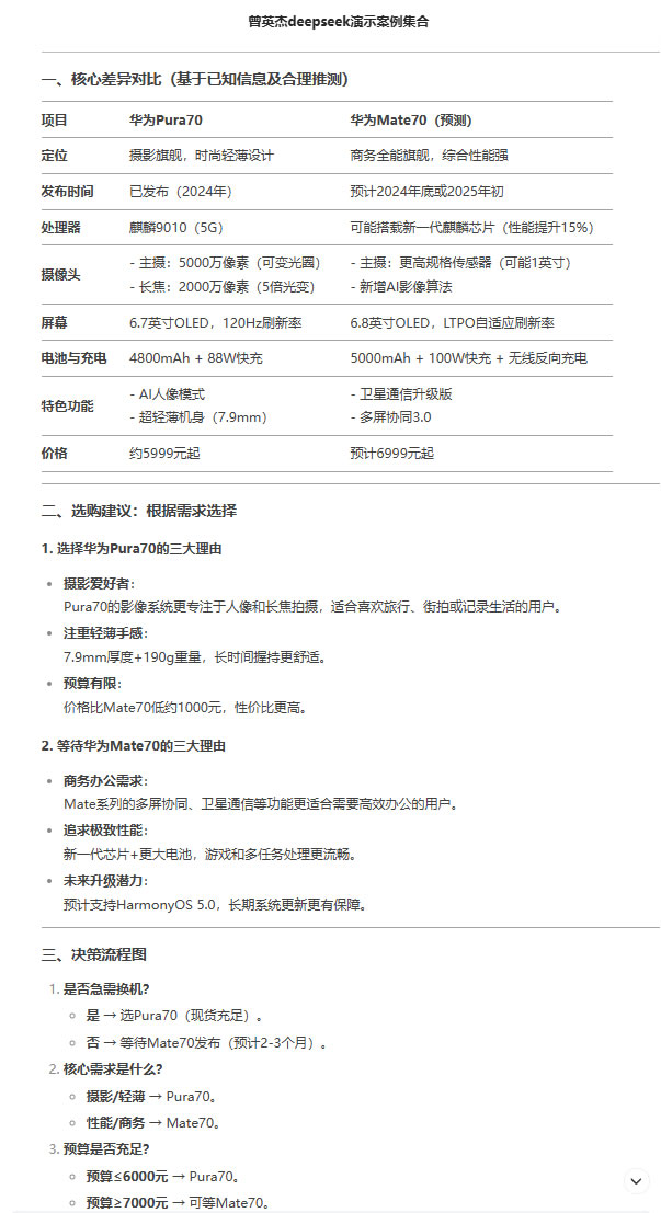 由于Mate70尚未發(fā)布,很多信息需要推測, 因此 在 比較時(shí)需要指出這些不確定性,并建議用戶如果時(shí)間允許,可 以等 待Mate70發(fā)布后再做決定。