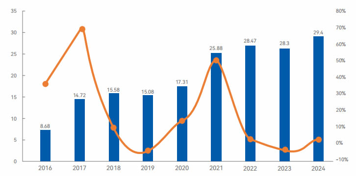 2024年全年,ZG工業機器人市場銷量超29.4萬臺。盡管受整體制造業企業生產預期下降、市場需求收縮等因素影響,工業 機器人面臨著一系列的增長壓力,市場仍處于去庫存和行業淘汰賽的關鍵階段,但同比2023年仍實現3.9%的微增。