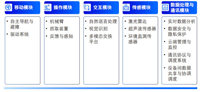 模塊化設計通過將機器人系統分解為多個軟硬 件模塊 ,廠商和用戶可以根據不同的應用需求 進行靈活組合和定制。這一設計理念不僅提升 了產品的適應性和可擴展性 ,還為技術的創新 與產品的迭代提供了可能性 ,是開放性的全棧 式智能服務機器人生態系統的基石。服務機器 人模塊化設計以多個軟硬件模塊——移動模 塊、操作模塊、交互模塊、傳感模塊和數據處 理與通信模塊為核心。通過這種靈活的設計, 服務機器人能夠大大提升在不同場景中能夠靈活應對復雜任務的能力。