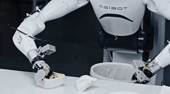 2)視覺+觸覺下,靈巧手準確執行酒杯和酒瓶的抓握,雙臂+雙手協同完成倒酒操作。 同樣在家用場景中,智元機器人可實現一手將日用品放入被另一只手提著的手提袋內, 協同效應較好;同時,揀取桌面不同位置的垃圾并置于垃圾桶中。