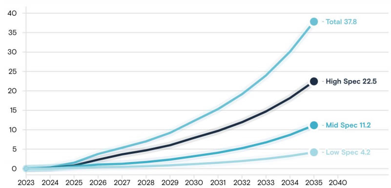 的總收入,到2050年可能產(chǎn)生約1萬億美元的總收入。”這一預(yù)測(cè)表明市場(chǎng)增長(zhǎng)將出現(xiàn)急劇加速,特別是在2040年至2050年期間。