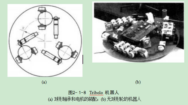 其次,移動(dòng)機(jī)器人底盤(pán)的移動(dòng)方向無(wú)直接控制,輪子不對(duì)稱的情況會(huì)產(chǎn)生各種類型 的誤差。 瑞士聯(lián)邦理工大學(xué)設(shè)計(jì)的 Tribolo 是采用3個(gè)球形輪的全向驅(qū)動(dòng)的實(shí)例,如圖2-1-8(a) 所示,3個(gè)球形輪各由一個(gè)電機(jī)激勵(lì),3個(gè)接觸點(diǎn)將球形輪懸掛起來(lái), 其中2個(gè)點(diǎn)由球形軸承給定,另一個(gè)由連接到電機(jī)軸的輪子給定。這種設(shè)計(jì)的機(jī) 器人機(jī)動(dòng)性比較好,而且設(shè)計(jì)簡(jiǎn)單,但是它只適用于平坦的路面和小路,要制造摩擦系數(shù)大的圓形輪子是十分困難的。