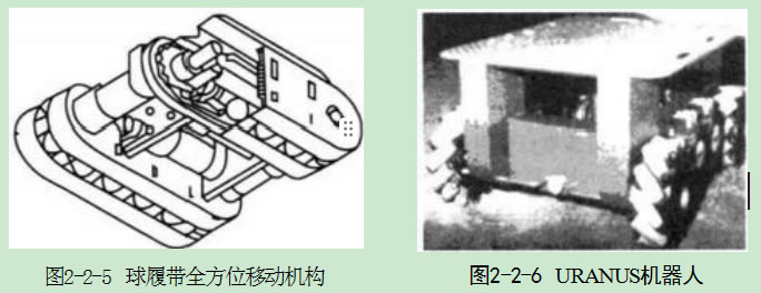 1992年,日本神戶制鋼所的西川晃平等人研制了一種球履帶全方位移動(dòng)機(jī) 構(gòu)3-11.123,結(jié)構(gòu)示意圖見(jiàn)圖2-2-5。該全方位移動(dòng)機(jī)構(gòu)有兩條履帶,每個(gè)履帶內(nèi)平 行放置兩條桿,分別由直流伺服電機(jī)通過(guò)履帶驅(qū)動(dòng),而每條履帶內(nèi)各自分別放入2個(gè)橡膠球,通過(guò)兩條履帶的運(yùn)動(dòng)組合及球的轉(zhuǎn)動(dòng)即可實(shí)現(xiàn)全方位移動(dòng)功能。