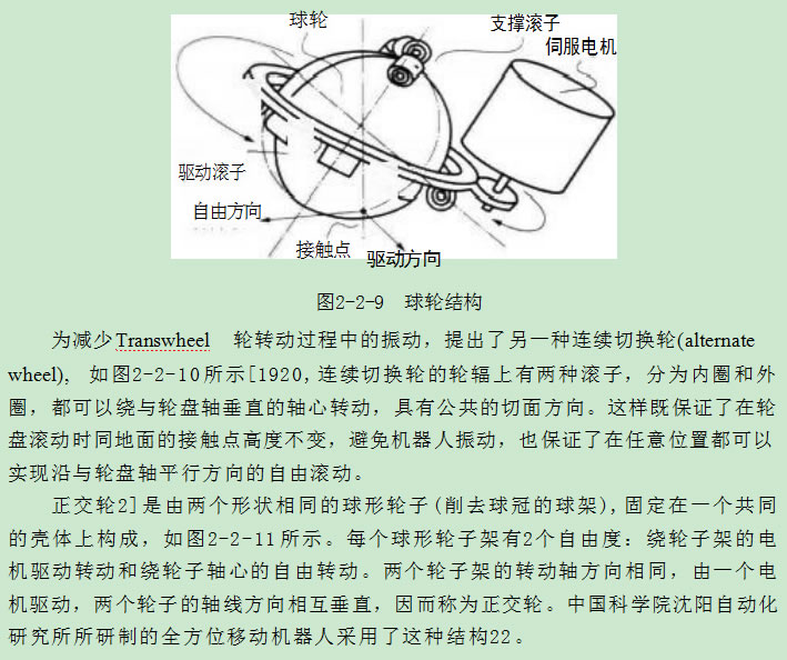 球 輪(ball wheel)由一個(gè)滾動(dòng)球體、 一組支撐滾子和一組驅(qū)動(dòng)滾子組成,其中 支撐滾子固定在車底盤(pán)上,驅(qū)動(dòng)滾子固定在一個(gè)可以繞球體中心轉(zhuǎn)動(dòng)的支架上,如 圖2-2-9所示15.16]。每個(gè)球輪上的驅(qū)動(dòng)滾子由一個(gè)電機(jī)驅(qū)動(dòng),使球輪繞驅(qū)動(dòng)滾子 所構(gòu)成平面的法線轉(zhuǎn)動(dòng),同時(shí)可以繞垂直的軸線自由轉(zhuǎn)動(dòng)。輪子的驅(qū)動(dòng)力是滾子 和輪子的摩擦力,使得輪子的驅(qū)動(dòng)力和速度受到限制,這也是球輪的缺點(diǎn)。同時(shí), 輪子在地面滾動(dòng)過(guò)程中吸附的一些灰塵,會(huì)在輪子和滾子的接觸點(diǎn)積累,影響兩者 之間的摩擦力,使輪子打滑,我們?cè)谑褂脻L動(dòng)鼠標(biāo)時(shí)都會(huì)有同樣的感受。因而,對(duì) 球輪的改進(jìn)方法是有效增加滾子和球體之間的摩擦驅(qū)動(dòng)力。