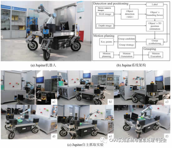 Jupiter[13]汕頭大學范衠團隊研制的移動操作機器人,該移動機器人由四輪獨立轉向的底盤和UR5機械臂組成(如圖6(a))。通過2D激光雷達信息采用Hector SLAM實現機器人對地圖的感知和自主導航規劃,通過D部的RGB-D相機采集目標物體深度和RGB圖像信息,并通過SSD網絡檢測目標物體,通過坐標轉換2D坐標轉換為三維空間坐標,后通過UR5機械臂進行抓取實驗(如圖6(b))。通過實驗測試,機器人單次完成導航、識別、抓取和放置的全流程需要大約212s,對單目標的抓取成功率可達98%(如圖6(c))。