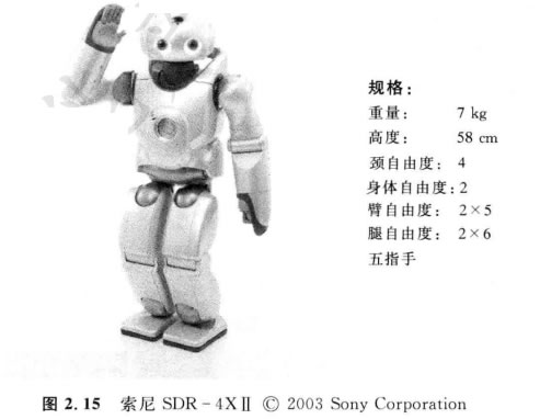 索尼夢想機(jī)器人,即SDR-4X Ⅱ模型,如圖2.15所示。這個流行的模型是1997 年開始的研究結(jié)果,它以運(yùn)動表演和交際娛樂(如跳舞和唱歌)為基本目的。這個具 有38個自由度的機(jī)器人,為了聲音的精細(xì)定向、基于圖像的人員識別、單板微型立體 景深圖的重構(gòu)以及有限的語音識別,裝有7個麥克風(fēng)。給定了流媒體和娛樂運(yùn)動的 目標(biāo),索尼公司花費(fèi)了巨大的精力設(shè)計(jì)了運(yùn)動的原型應(yīng)用系統(tǒng),它能使他們的工程師 以簡捷的方式編排舞蹈。要注意的是,SDR-4XI 比較小,站立58cm, 重量僅6.5kg。