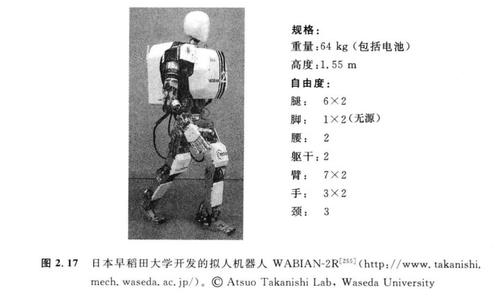 雙腳機(jī)器人一個重要的特征是它們具有類似人的外形。它們可以被制造成和人 相近似的尺寸,這使得它們在人機(jī)交互的研究中成為出色的運(yùn)載工具。日本早稻田 大學(xué)制造的WABIAN-2R (圖2.17)正是作這種研究的[255]。WABIAN-2R 被設(shè)計(jì) 成能夠模仿人的運(yùn)動 , 并甚至設(shè)計(jì)成能夠像人一樣跳舞 。