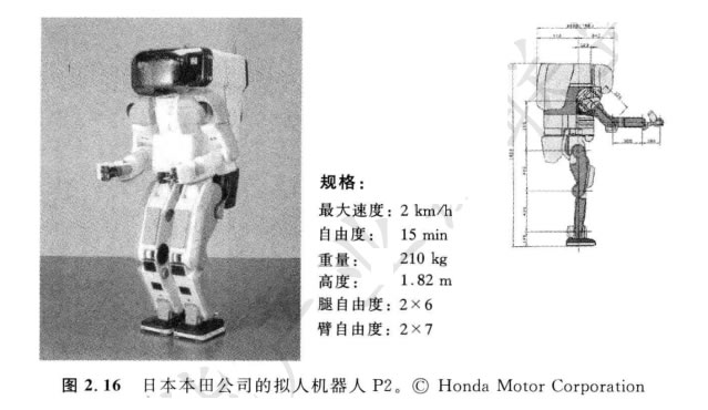 本田公司的擬人機(jī)器人項(xiàng)目有著值得注意的發(fā)展經(jīng)歷。但是此外,它還抓住了 激勵的非常重要的工程挑戰(zhàn)。圖2.16展示了模型 P2, 它是Z新模型 Asimo (在發(fā)明 移動性中有超前步伐)Z直接的先驅(qū)。注意,Z新的本田 Asimo 模型仍然比 SDR- 4X I大得多,高120 cm, 重52 kg 。這可在保持不危險(xiǎn)尺寸和姿勢的同時,能在有樓 梯和臺階的人類環(huán)境中具有實(shí)用的機(jī)動性。也許這是展示仿生的雙腳上下樓梯的第 一個機(jī)器人。這些本田擬人系列的機(jī)器人不是專門為娛樂目的而設(shè)計(jì),而是作為整 個社會的人類幫手而設(shè)計(jì)。例如,本田公司把Asimo 的高度當(dāng)作機(jī)器人能對人類環(huán) 境進(jìn)行管理操作(如控制燈開關(guān))的Z小高度。