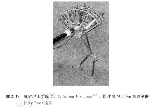 雙腳機(jī)器人只能在某些限制內(nèi)靜態(tài)地穩(wěn)定。因此,像P2 和WABIAN-2R 這樣的 機(jī)器人即使站著不動,通常也需要連續(xù)地進(jìn)行伺服平衡校正。而且,各條腿都需要有足 夠的容量以支撐機(jī)器人全部重量。在四腿機(jī)器人情況下,平衡問題隨各條腿上的負(fù)荷 需求而變得容易解決。雙腿機(jī)器人的 一個 出色設(shè)計(jì)是麻省理工學(xué)院設(shè)計(jì)的Spring Fla- mingo (圖2. 18)。這個機(jī)器人與腿激勵器相連,插入了彈簧,實(shí)現(xiàn)更有彈性的步態(tài)。通過與限制膝蓋關(guān)節(jié)角度的“膝蓋骨”相結(jié)合,F(xiàn)lamingo 實(shí)現(xiàn)了驚人的仿生運(yùn)動。