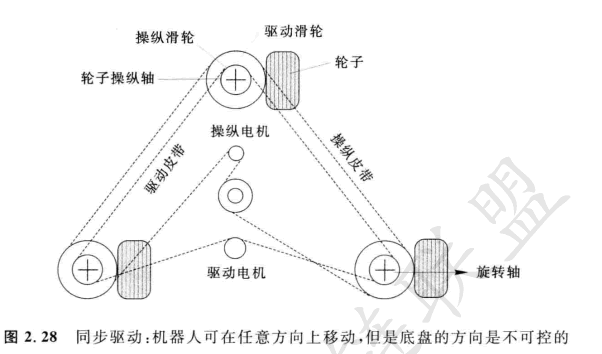 在室內移動機器人應用中,同步驅動結構(圖2.28)是一種流行的輪子裝配,也是 一個令人很感興趣的結構。因為它雖然有3個驅動和操縱輪,可是總共只用了2個電機。一個平移電機設置3個輪子一起的速度; 一個操縱電機,使所有輪子繞著它們 各自的垂直操縱軸一起旋轉。但要注意的是,輪子是相對于機器人的底盤受操縱的, 所以,沒有直接方法重新設定機器人底盤的方向。實際上,由于凹凸不平輪胎的滑動,在整個時間里底盤方向一定會漂移,造成旋轉的航位測定誤差。