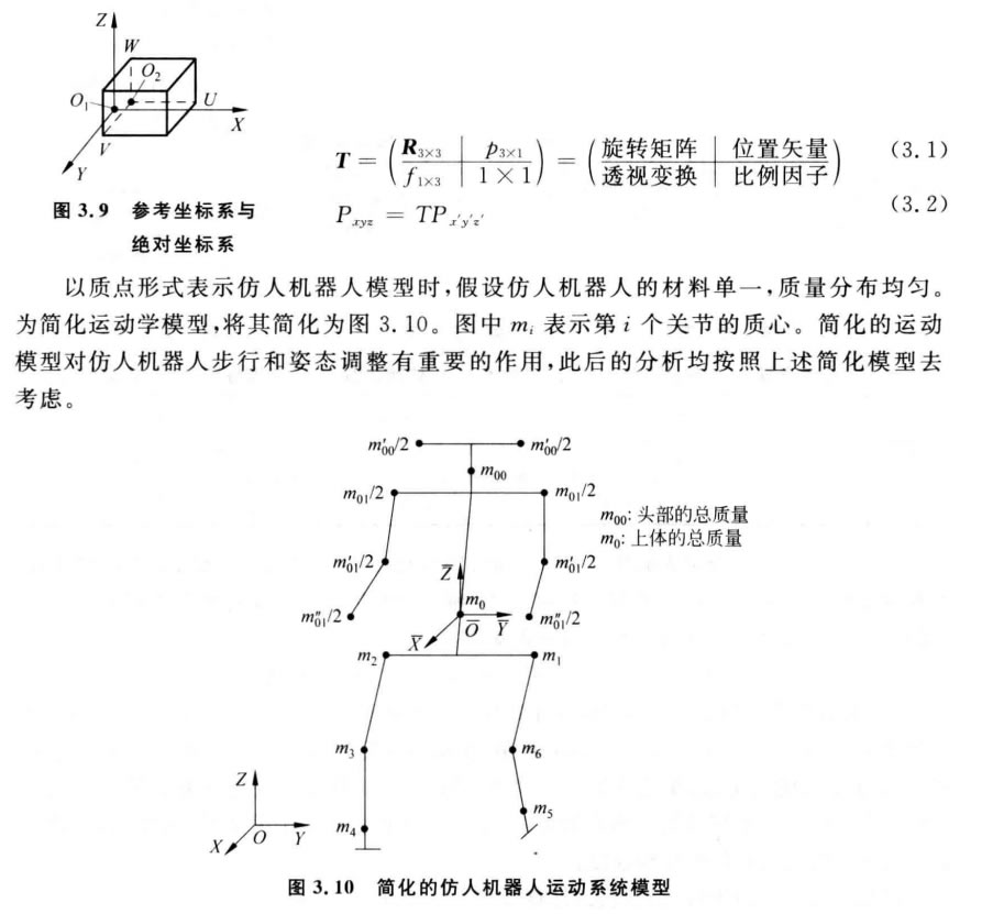 智能接待仿人機器人除了具有腿部的行走功能外,還具有上身的功能,自由度也比雙足機器 人成倍的增加。從仿生角度看,人的手臂在運動中起著協調運動的作用,智能接待仿人機器人的手 臂是d立運動的,在行走運動過程中起著重要的調整作用。從運動鏈角度看,智能接待仿人機器人由于有手臂運動,故它是由三條鏈組成的復合運動鏈,運動學、動力學、運動規劃上更為復 雜,不能直接用雙足機器人的動力學模型來描述[94]。本節將在雙足機器人模型的基礎上, 結合智能接待仿人機器人的運動特點,建立一個合適的運動模型,導出步行運動的數學描述。 本節設計的是一個19 DOF 的智能接待仿人機器人,暫不考慮其頭部 和手指的自由度。