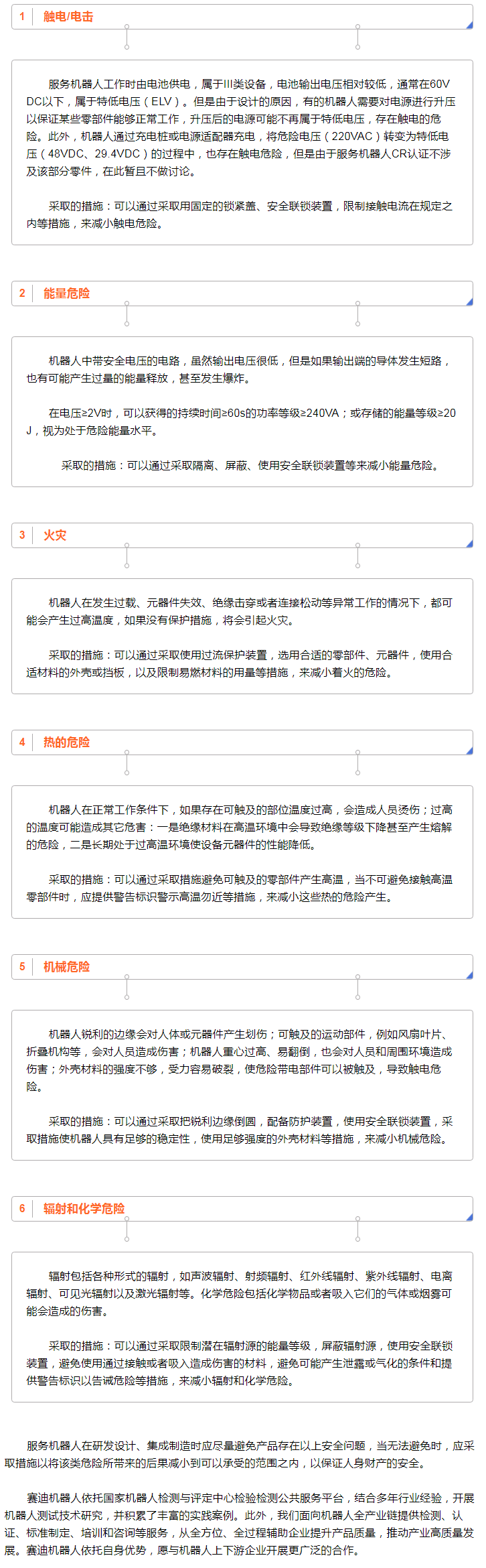 GB 4943.1-2011涵蓋的服務(wù)機(jī)器人潛在危險有:電擊、與能量有關(guān)的危險、著火、與熱有關(guān)的危險、機(jī)械危險、輻射、化學(xué)危險等。不同的服務(wù)機(jī)器人,由于設(shè)計和使用場所的不同,各自潛在的主要危險類型不一樣,需要根據(jù)實際情況進(jìn)行判斷。