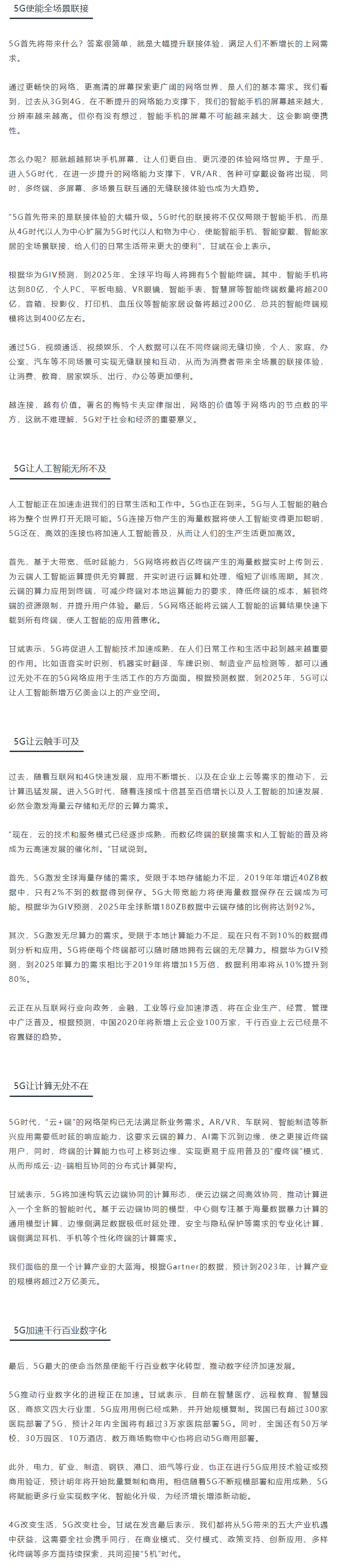 2020年6月30日,在GSMA舉辦的新基建與企業(yè)數(shù)字化論壇上,華為無線網(wǎng)絡(luò)S席營銷官甘斌發(fā)表了《5G=5“機”,新價值,新機遇》的主題演講。會上,甘斌詮釋了5G將驅(qū)動聯(lián)接、AI、云、計算、行業(yè)應(yīng)用五大產(chǎn)業(yè)升級,為數(shù)字經(jīng)濟發(fā)展注入新動能。