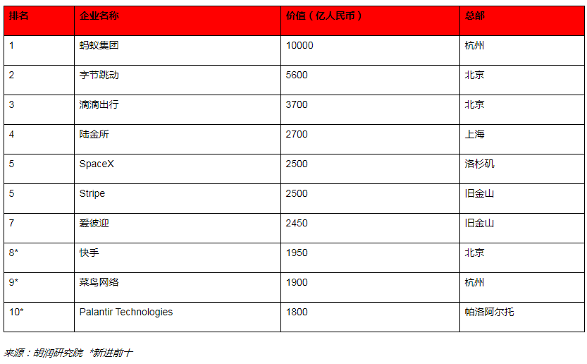 值得驕傲的是,十大獨角獸6個來自中國,除螞蟻集團和字節跳動以外,還有滴滴出行、陸金所、快手和菜鳥網絡,快手、菜鳥網絡和加州大數據分析公司Palantir首次進入十大獨角獸。