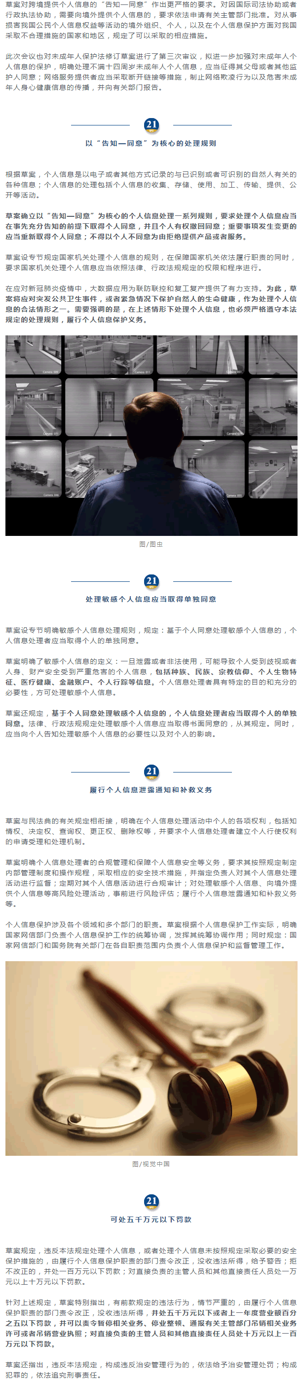 據(jù)介紹,草案共八章70條,明確了適用范圍,健全了個(gè)人信息處理規(guī)則,完善了個(gè)人信息跨境提供規(guī)則,明確個(gè)人信息處理活動(dòng)中個(gè)人的權(quán)利和處理者義務(wù),并明確履行個(gè)人信息保護(hù)職責(zé)的部門。
