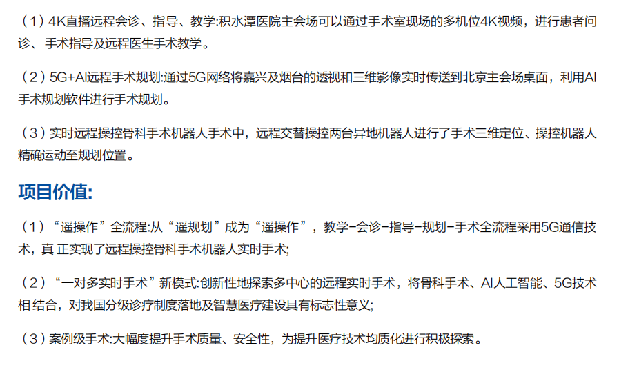2019年6月27日,北京積水潭醫院田偉院長在機器人遠程手術中心,通過遠程系統控制平臺,與嘉興市D二醫院和煙臺市煙臺山醫院同時連接,成功完成了首例骨科手術機器人多中心5G遠程手術。