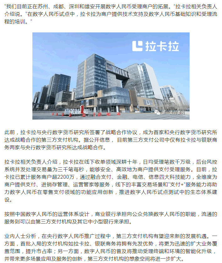 據(jù)了解,作為首家開通數(shù)字人民幣受理服務(wù)的支付機(jī)構(gòu),此次拉卡拉參與蘇州雙十二活動的商戶門店數(shù)近千家,包括全國知名連鎖藥店,商超,化妝品店,餐飲店,酒店,連鎖美甲店,汽配店等。此次蘇州數(shù)字人民幣消費(fèi)紅包測試支持掃一掃、碰一碰(雙離線)等非接觸支付方式。