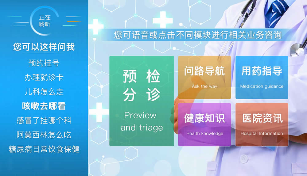 智能導診機器人開發初衷是解決門診導 醫人數較少、重復問答較多的現實情況。在醫 院業務G峰期人滿為患的情況下,智能醫療 服務機器人可以及時響應,可以指導患者就 醫、引導分診,同時向患者可以介紹醫院就 醫環境、門診就診流程和醫療保健知識等。 導診機器人通過語音識別、語音合成和自然 語言理解等技術,支持語音、觸控、圖像等 多種交互方式,改善就醫體驗,提G醫療服 務質量,是醫院智慧醫療的重要組成部分和 具體體現。 |