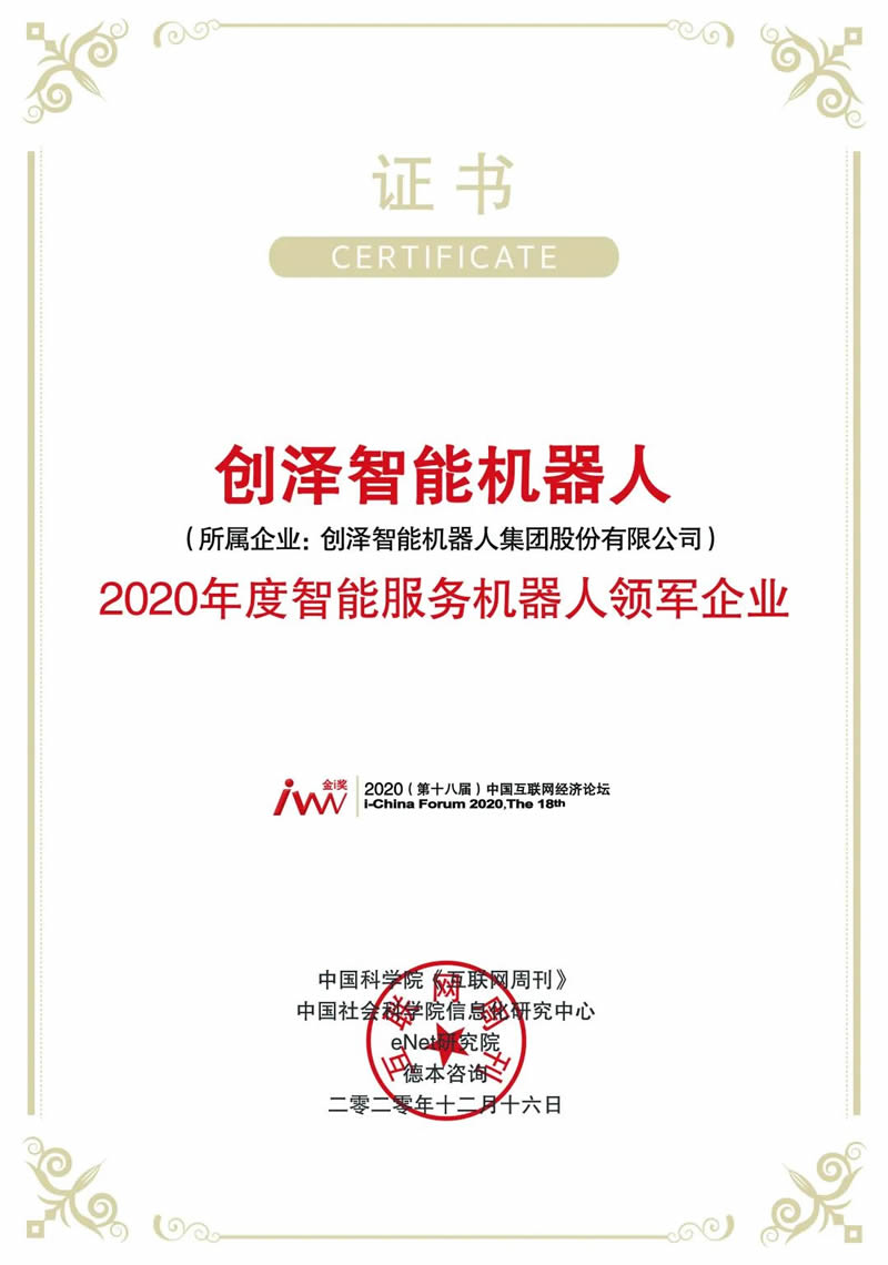 創(chuàng)澤智能機(jī)器人榮獲2020年度智能服務(wù)機(jī)器人L軍企業(yè)獎(jiǎng) |